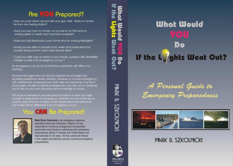 Paladin Environmental Publishing; first edition (November 1, 2007) Trade Paper - 256 pages ISBN-10: 0-9782206-0-9 Personal emergency preparedness is a lot different than organizational emergency preparedness in a lot of ways - companies plan for emergencies and maintain equipment in a state of readiness at all times, focused on a few specific risks, usually with regulatory requirements to keep them focused on the job at hand. In my case, professional HazMat responder that I was for years, it started with a flat tire .................. in pitch black conditions! First, the battery in the flashlight I had with me was dead, and I didn't have a spare. I had the tools to change the tire, only to find the spare was also flat ................. and at at a crucial moment, calling for road side assistance, the battery on my cell phone, after continuous use that day, also died in mid-sentence! ARRRGGGGHHHH! In the immortal words of the Genie in Aladdin ................. boy, did I feel sheepish! I realized then a great trite truth that seems to permeate our society; namely, that we have it ingrained that preparing for emergencies is a job for governments, not individuals. Even professional and specialist that I am, I was also sucked into the idea that personally I needed to do nothing for myself ............... and I realized I need to change that. So my odyssey as an author began ................... Being an author starts with research, and what I discovered interested me - namely that there is huge amounts of information and advice on personal emergency preparedness out there buried practically everywhere, in that infinite universe called the Internet, for every personal situation imaginable. However, there was ABSOLUTELY NO PLACE, on the Internet, or in print, that attempted to collect it all! I also had to change my thought processes about emergencies as well, and broaden both my perspective and definition as to just what an emergency may be. Most emergencies, from an organizational standpoint, are thought of in major terms, like a house fire, forest fire, flood, earthquake or other natural disaster. But has anyone ever considered how you prepare for such mundane things as a boat trip, car trip, or hike in the woods - seemingly innocuous pastimes, and run of the mill, supposedly, but what if something goes wrong? What about travelling abroad to a foreign country? Or preparing for an emergency where a child, person with a disability, or a senior may be impacted? What do you do if you have to evacuate, and take a pet with you, or leave them in your home? What about hot days, and heat stress? How about being stuck alone at the office, in a blizzard, with no food supplies? Or having a major emergency which knocks out all our modern services (Internet, SmartPhone, ATM machine, or credit machines, for more than a week?!?!? We don't think we will ever live in isolation for more that a few minutes nowadays, with our phenomenal ability to span the globe, technology and communications wise, but it can happen - most emergency and government agencies actually encourage their citizens here in North America, to prepare to survive, using their own resources, for 72 hours, possibly more in isolated areas. You can be prepared personally for emergencies, by following such simple steps, such as having a supply of spare batteries, keeping sufficient food for a week around the house, some non-perishable, and having a small supply of money around, or checking to see your insurance will actually cover such things as property damage related to floods (many insurance policies don't). Or ensuring your always have an emergency supply of critical medicines on hand, and know where you can obtain more on an emergency basis. As an example, when we were preparing for potential forest fires near our home some advice from my book we actually considered practically included: